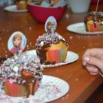 Czas ozdabiania babeczek to niezwykle zajmujący proces. Dzieci miały do wyboru rozgrzaną czekoladę, kolorowe posypki, oraz wzory postaci z ulubionych bajek. Wszystko przebiegało bardzo precyzyjnie do czasu, gdy dzieci zapragnęły pomalować buzie kolegów. Zrobiło się bardzo wesoło… Na zakończenie spotkania dla całkowitego szczęścia dzieci pokolorowały podobizny Cecylki i Gąski Walerii, a piękne czekoladowe wytwory będą cieszyły oczy w domach małych cukierników. Bardzo dziękujemy Paniom: Patrycji Wojtachnie za upieczenie babeczek i prowadzenie wspaniałego spotkania dla dzieci, Małgorzacie Porębskiej za pomoc dzieciom w twórczej pracy oraz nauczycielce Ewie Klaus za wspieranie dzieci podczas pracy w grupach plastycznych. Czekoladomania w naszej bibliotece dała dzieciom mnóstwo radości. Uszczęśliwione, że poznały nowych bohaterów książkowych rozróżniały smaki czekolady, dowiedziały się o wartościach zdrowotnych kakaowca i przeżyły odkrywcze chwile, którymi z pewnością podzielą się z najbliższymi.
