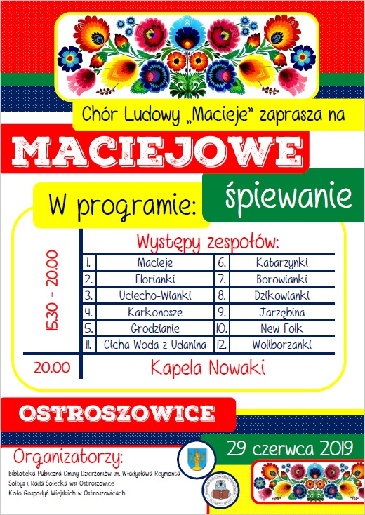 Już po raz kolejny Ostroszowice i Zespół Macieje niezwykle serdecznie przywitały gości na „Maciejowym śpiewaniu”. Dwanaście zespołów zaprezentowało na scenie swoje muzyczne umiejętności z prawdziwą pasją i zaangażowaniem. Biorące udział w „Maciejowym śpiewaniu” zespoły: Florianki, Macieje, NEW-FOLK, Katarzynki, Uciecho-Wianki, Jarzębina, Borowianki, Dzikowianki, Cicha Woda, Karkonosze, Grodzianie i Woliborzanki otrzymały z rąk Dyrektor Biblioteki Publicznej Gminy Dzierżoniów im. Władysława Reymonta Justyny Kaczorowskiej pamiątkowe podziękowania. Dużą niespodzianką dla przybyłych było wykonanie „Ostroszowickiej Pieśni” napisanej przez Zespół Macieje. Tegoroczne występy oglądali zaproszeni goście, a wśród nich: Pan Marek Chmielewski Wójt Gminy Dzierżoniów, Pan Ryszard Brzeski Sekretarz Gminy, Pani Urszula Zając dyrektor Zespołu Szkolno-Przedszkolnego w Ostroszowicach, ks. Paweł Kuriata – nowy proboszcz ostroszowickiej parafii, radni i sołtysi Gminy Dzierżoniów. Całość występów udokumentował niezawodny Jerzy Kulka z portalu DOLFIL.pl Dolnośląskie i Folkowo.