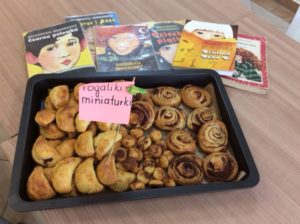 Niezwykle smaczne, literackie i nie tylko literackie, kąski czekały na wszystkich chętnych 30 marca w Bibliotece Publicznej Gminy Dzierżoniów im. Władysława Reymonta w Mościsku. Opisy posiłków, rozmowy przy stołach i wywołujące uśmiech dyskusje przeplatane łacińskimi sentencjami, które można spotkać w każdej z książek Małgorzaty Musierowicz, stały się fundamentem naszego spotkania. Dołączyliśmy jednocześnie do długiej listy miejsc, w których zawitało III Ogólnopolskie Czytanie Jeżycjady. Przez cały marzec podsuwaliśmy czytelnikom przepisy na smakołyki. Niektórzy postanowili się podzielić nowymi kuchennymi umiejętnościami i przynieśli na sobotnie spotkanie swoje kulinarne eksperymenty. Był więc murzynek Gabrysi, były miniaturowe drożdżowe rogaliki oraz złote jabłka Hesperyd. To