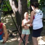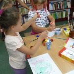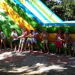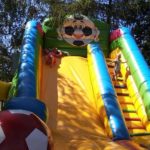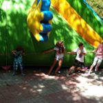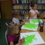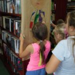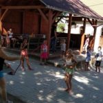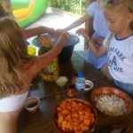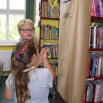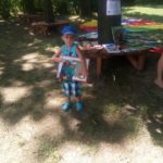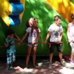 Na dzień dobry każdy mógł sobie wybrać książkę w specjalnie przygotowanym kąciku pn. „Książka na wakacje” oraz wziąć udział w warsztatach kulinarnych, gdzie razem przygotowaliśmy dla wszystkich Zamkowy Kocioł. Był zamek dmuchany, warsztaty strzelania z łuku, zabawa z herbownicą, chustą animacyjną i tunelem, skakanie przez linę, czytanie i wspólna animacja wiersza Juliana Tuwima pt. „Rzepka”. Każdy z uczestników otrzymał słodkie upominki a na koniec posililiśmy się upieczoną przez kucharza Wojtka przepyszną Zamkową Strawą z Zamkowego Kotła.