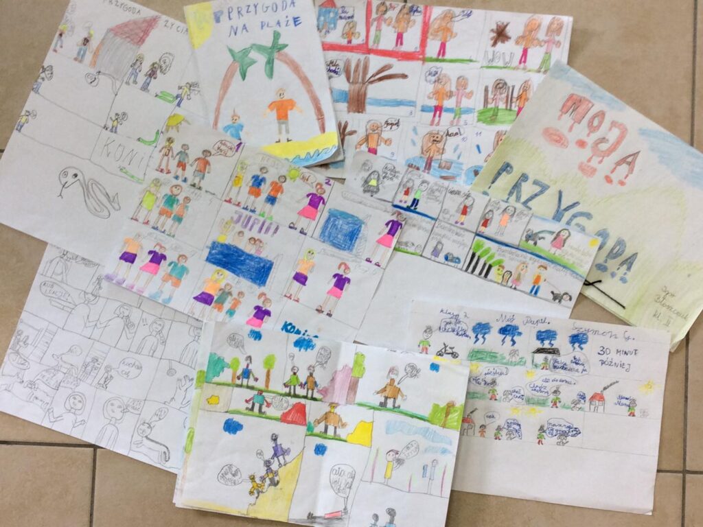 Równie ciekawe okazały się zajęcia z ulubionymi komiksami. Drugoklasiści ze Szkoły Podstawowej im. Kornela Makuszyńskiego w Piławie Dolnej uczyli się m.in. jak wyrazić emocje aby pasowały do komiksowych dymków. Druga i trzecia klasa w Mościsku również zanurzyła się w świat komiksu. Powstały ciekawe prace, w których przygoda goni przygodę.