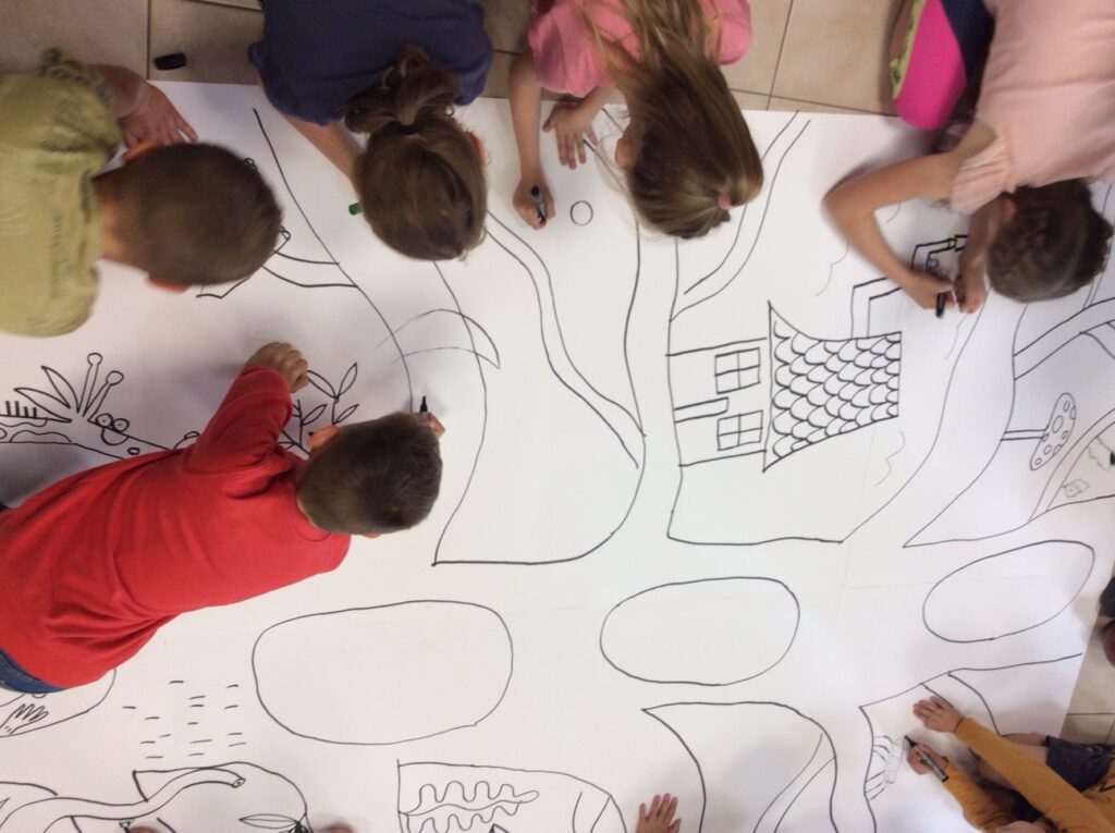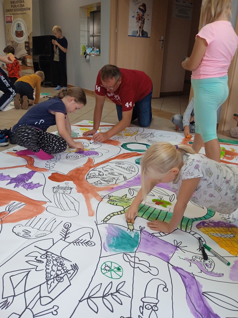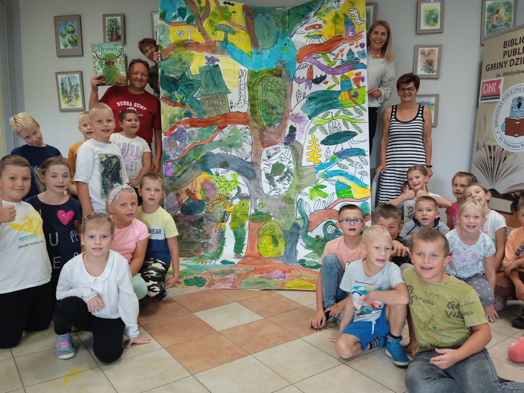 Dzieci ze Szkoły Podstawowej im. Jana Pawła II w Tuszynie i Zespołu Szkolno-Przedszkolnego w Mościsku mogły posłuchać o tym jak wygląda praca ilustratora i wspólnie z artystą wykonać olbrzymie rysunki. Dodatkową atrakcją była trwająca do końca września w galerii wystawa plansz z książki „Drzewa” Piotra Sochy i Wojciecha Grajkowskiego, udostępniona przez Wydawnictwo Dwie Siostry.