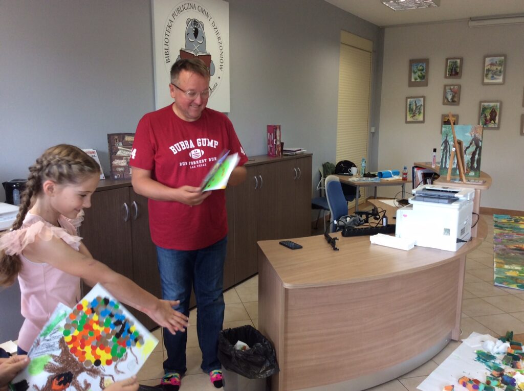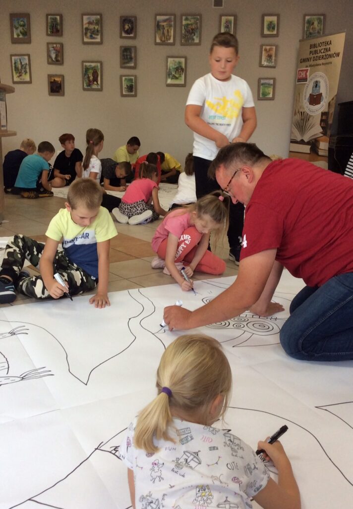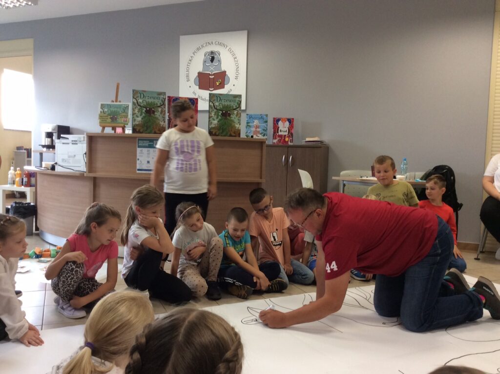 Piotr Socha na zaproszenie Dyskusyjnego Klubu Książki pojawił się 8 września w Bibliotece Publicznej Gminy Dzierżoniów w Mościsku, aby poprowadzić warsztaty przyrodniczo-plastyczne związane z książką „Drzewa”. Nie brakło pomysłów, kolorów i wyobraźni!