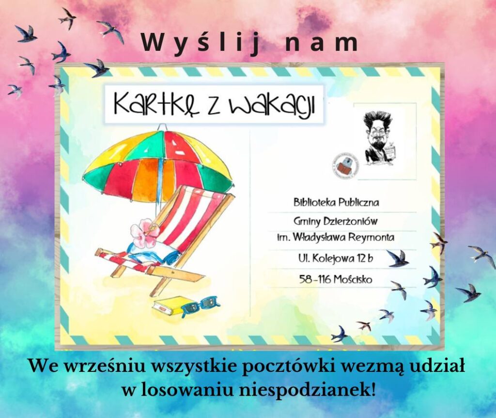 Gdzie spędzacie tegoroczne wakacje? Nawet jeśli tylko w swoim ogródku lub pokoju kartka pocztowa od Was sprawi nam ogromną radość! Może sami ją zaprojektujecie i wykonacie? Czekamy z niecierpliwością. We wrześniu wszystkie pocztówki wezmą udział w losowaniu nagród! Adres? Na plakacie!